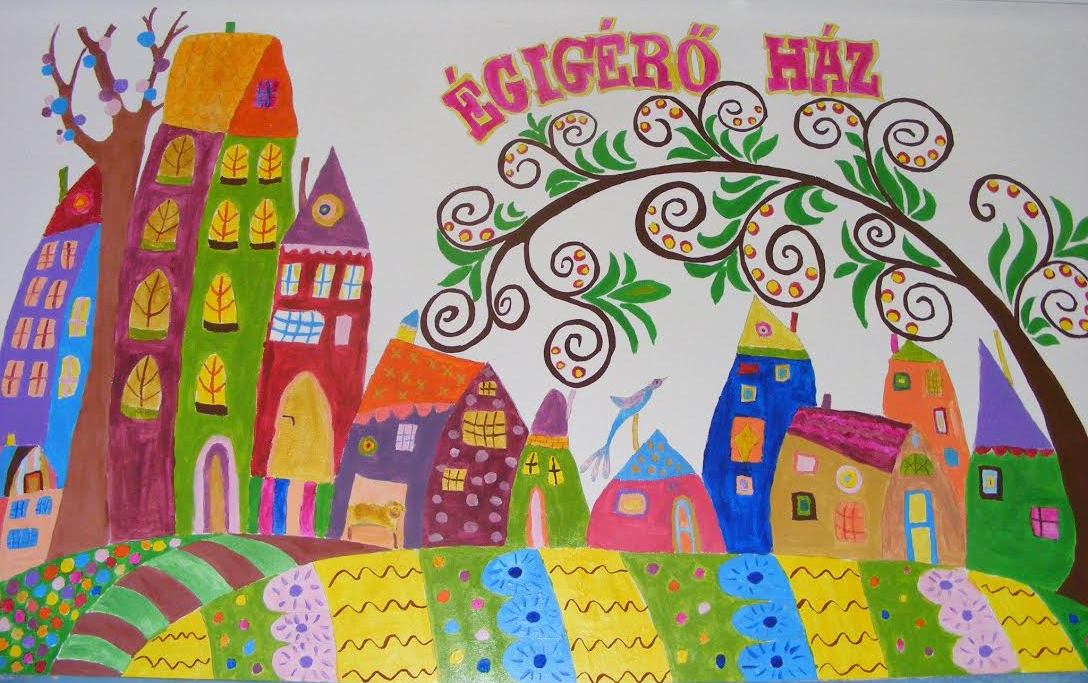 A fentebbi képet (Karla Gerard egyik képének másolata) barátnőmmel festettük fel az Égigérő Ház bejáratának főfalára. Az egész ház a gyermekközpontúságot, a vidámságot, családias légkört tükrözte.